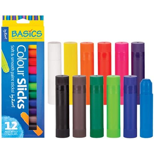 Colour Slicks by Zart, are a super smooth lipstick-like paint stick in an assorted pack of vivid colours. Slicks glide easily on to a variety of surfaces and they produce intense results! Fast drying and washable, they are ideal for all ages, and are an excellent clean and portable painting solution. The easy to use twistable mechanism means no sharpening is required. This Colour Slicks by Zart assortment includes 12 colours ? black, white, brown, dark green, light green, light blue, dark blue, purple, pink, orange, red and yellow.