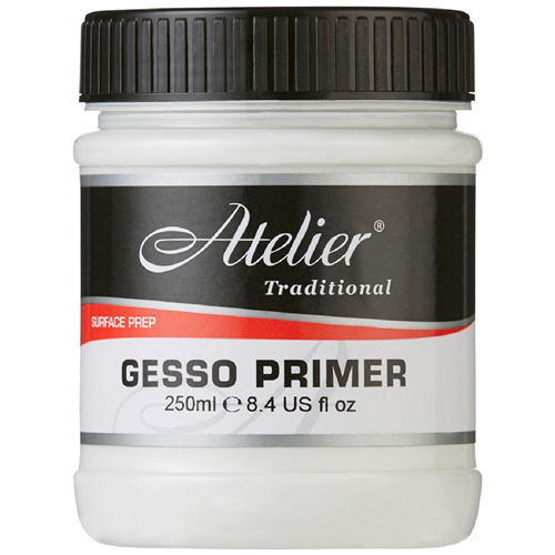 Atelier Gesso Primer is a water based, flexible acrylic ground with a high grit content. Designed to provide a stable white surface on which to paint. Atelier Gesso Primers may be used directly from the container for all over thick textural effects. Atelier Gesso Primer is suitable for both acrylic and oil paintings, providing good paint adhesion and preventing loss of moisture. Atelier Gesso Primer can be used directly from the container, and if applied thickly with a brush it will give texture to your canvas for painting. Alternatively, for a more even finish you can mix the gesso with water and apply 2-3 thinner coats. The gesso will dry white, giving you a clean and bright surface to begin painting.