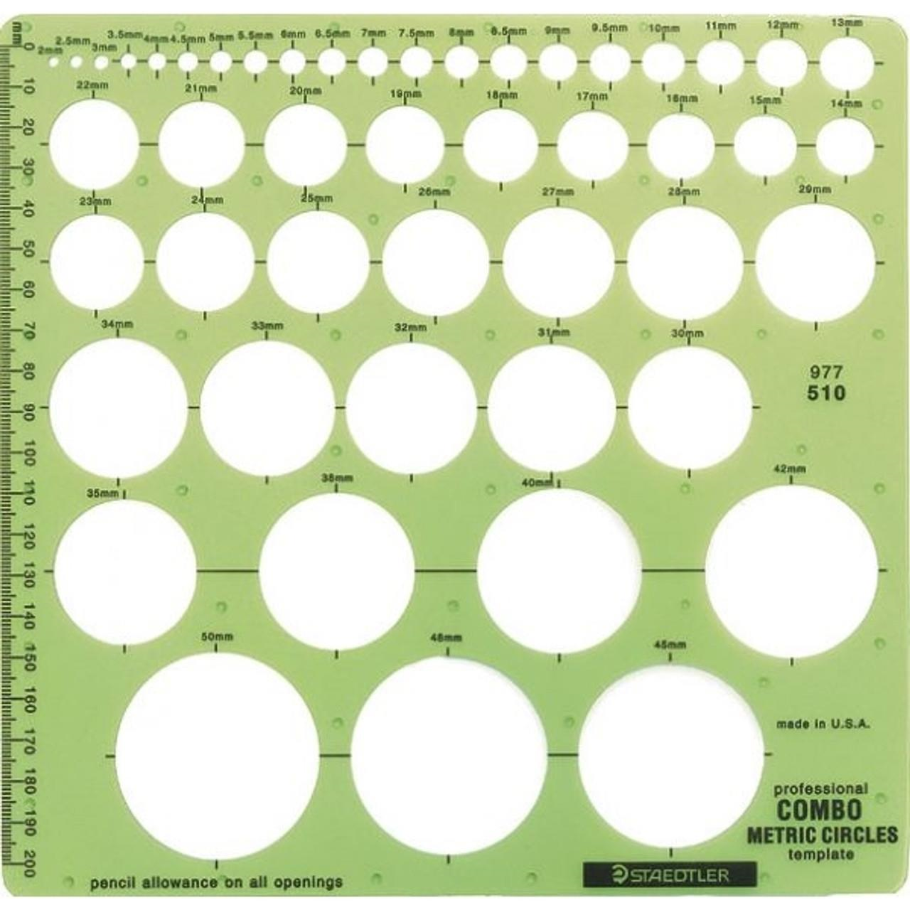 STAEDTLER LARGE CIRCLE TEMPLATE. This template contains 48 circles from 2mm to 50mm with diameter sizes ranging from 2mm to 10mm in 2mm and 3mm increments. distinctly printed in easy-to-read black ink on clear green plastic with ink risers.