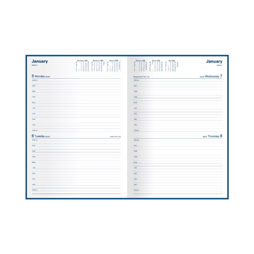 • Lay flat opening, ribbon marker, 2 days to a page layout.