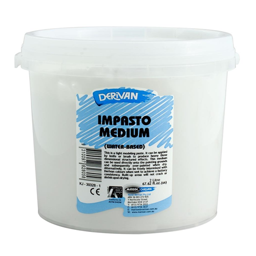 Impasto Medium - Adds Body - 2Lt. This medium is a heavy-bodied paint, free of colour pigmentation (it isn't a gel). It is most valuable for oil painting brush stroke and impasto techniques, particularly when heavy built-up areas of colour are required. Impasto Medium dries to a low subdued sheen which is similar to the sheen on a dried paint film of acrylic colour. It is equally water-resistant. Impasto Medium allows for free intermixing with the Derivan colours in any proportion. There is little visual colour loss when equal volumes of a Derivan colour and Impasto Medium are intermixed. Although Impasto Medium is not fully transparent when dry, it does not appear to alter the richness of Derivan colours in any way. Impasto Medium is also suitable for use as a light modelling compound. It can be applied by knife or brush in heavy blobs onto the original primed canvas and when dry, fully over-painted with Derivan colours. Do not use Impasto as a transparent glue or size where its slightly milky opacity could cause some discolouration. However, it makes a high quality acid-free glue or size where transparency is not a concern.