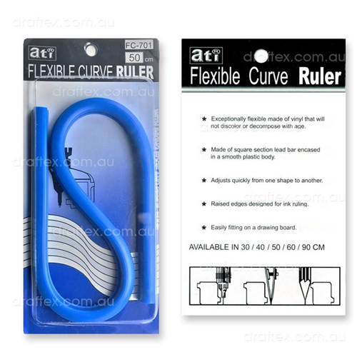 Draftex Flexible Curves can be bent to form the desired curved shape. A combination of spring steel and lead in the core allow the flexible curve to hold that shape. Adjusts Quickly from One Shape to Another.One Edge has Raised Strip for Drawing with Ink.Available in Five Lengths; 30cm, 40cm, 50cm, 60cm and 90cm.
