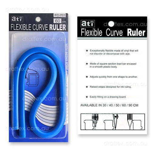 Draftex Flexible Curves can be bent to form the desired curved shape. A combination of spring steel and lead in the core allow the flexible curve to hold that shape. Adjusts Quickly from One Shape to Another.One Edge has Raised Strip for Drawing with Ink.Available in Five Lengths; 30cm, 40cm, 50cm, 60cm and 90cm.