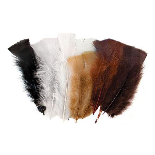 Natural coloured feathers in six natural colours including Black, Grey, White, Tan, Burnt Sienna, and Chocolate. Approximately 15cm in length. Ideal for collage, decoration and natural artworks.