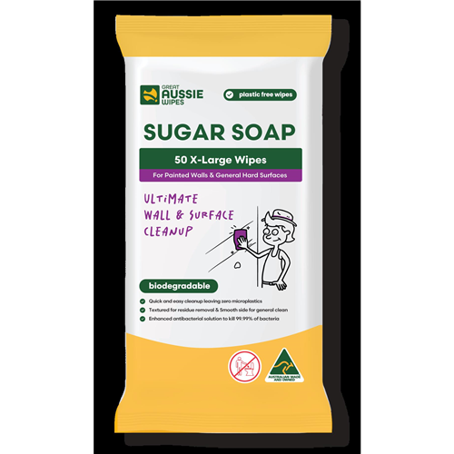 Great Aussie SUGAR SOAP wipes are the go to wipes for general clean up of painted walls and surfaces to remove grime, dirt, scuff marks, finger prints, food residues and general surface deposits. Made of tough plant based textured fabric, SUGAR SOAP wipes ensure your home and workplace are safe and free of any microplastics after surfaces are wiped down. Made with textured facing to support the removal of stubborn and heavier residues and a smooth facing for general clean up. Enhanced with antibacterial properties to kill 99.99% of germs and bacteria left on surfaces. Key Features Quick and easy cleanup leaving zero mircoplasticsTextured for residue removal & smooth side for general cleanEnhanced antibacterial solution to kill 99.99% of bacteria