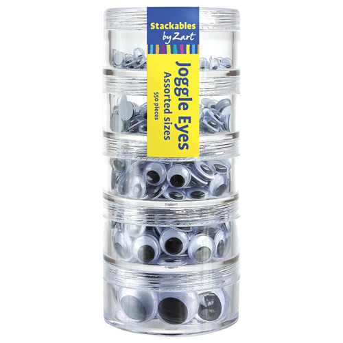 Pack of 550 (275 pairs) 5 assorted sizes 5 -20mm diameter Comes in 5 clear stackable storage containers A black pupil on a white background with a sturdy clear plastic shell. Use craft glue or Supertac to attach to your projects.