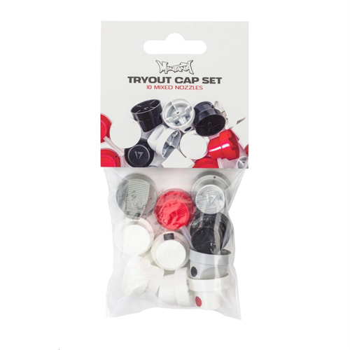 The Montana TRYOUT Cap Set is an all-round cap set that enables users to try a variety of caps and their characteristics. Consisting of ten different caps, the assortment has caps that offer varying spray outputs from skinny, fat, rectangular and round. Apart from the Level Cap system which is optimised for use on Montana GOLD, the TRYOUT CAP set can enable graffiti artists, street artists, urban artists, DIYers, Crafters and practical object painters all to experiment with different potential spray trajectories that all fit on female valve cans. Making them prefect for use with Montana GOLD, Montana BLACK and Montana WHITE cans to name a few. The caps featured in the TRYOUT CAP set are; Fat Cap Gold / Black, Fat Cap White/ Pink, Flat Jet Medium Black / Yellow, Flat Jet Red / Black, Skinny Cap Aerosol Art, Skinny Cap Black / Black, Skinny Cap Maclaim, Skinny Cap White / Beige, Soft Cap Grey / Blue and Needle Medium Liner Cap Red / Transparent. The Montana TRYOUT CAP set, something for everyone.