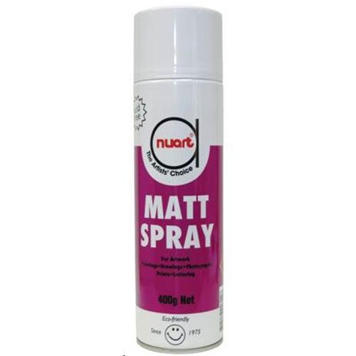 Nu Art Matt Spray 400g A quick drying permanent matt coating for Photographs, Paintings, Drawings, Artwork, Prints, Lettering etc Eliminates glare from glossy objects Provides a permanent and non-yellowing finish.