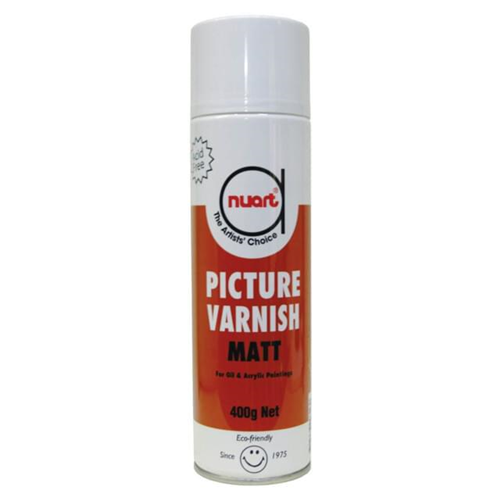 Spray Picture Varnish - Matt - 400gm High quality clear gloss varnish with a non-reflective mat finish for oil & acrylic paintings. Water-like clarity that will not yellow with age. Retains flexability - will not become brittle with age. May be removed with gentle solvent making restoration easy.