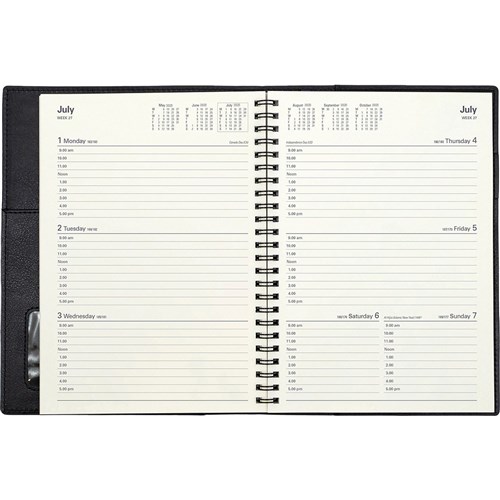 Flexible PVC cover management wiro diary, stitched edges and deluxe pocket inside the coverTwin wiro allows you to lay the diary flat on your deskIncludes Australian and New Zealand holidays and school terms, current and forward year planners, weights & measures plus much more.1 hour appointment 9am - 5pm