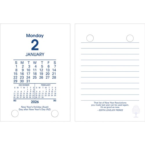 A must for all businesses, our Desk Calendar refills include special quotes and "on this day" notationsSized to suit most standard refill standsIncludes Australian and New Zealand holidays and school terms