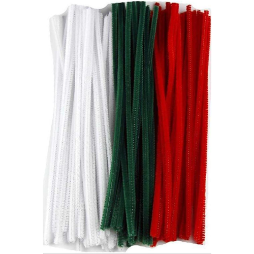 Assorted coloured chenille stems great to create and decorate constructions. Size: 6mm x 300mm length. Pack of 100 . Christmas - colours of green, red and white.